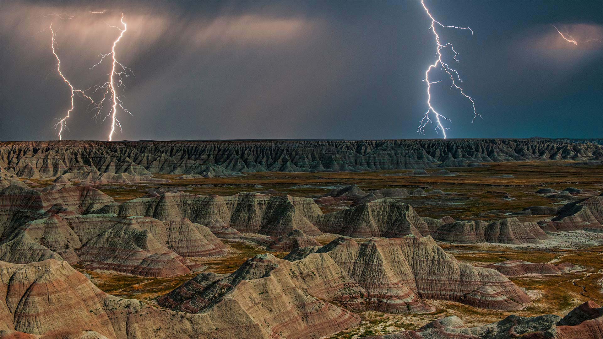 Rock formations in Badlands National Park during a lightning storm